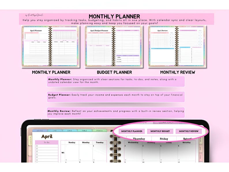 Weekly Budget, Grocery Budget, Travel & Event Budget, Gift Planner, Pet & Clothing Budget Trackers.