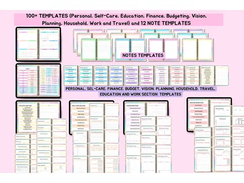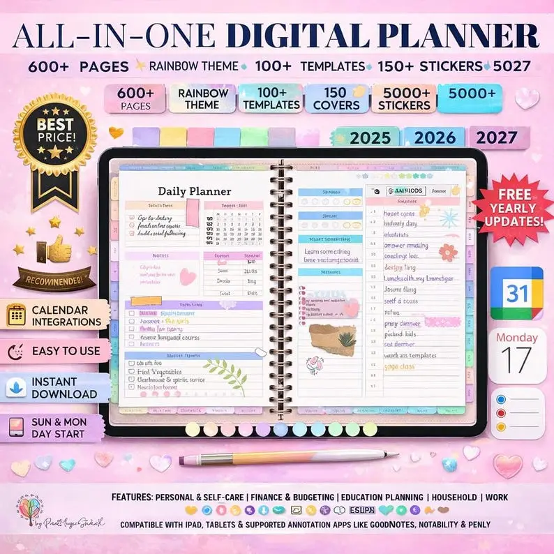 Stay organized, creative, and productive with the ultimate All-In-One Digital Planner, designed for GoodNotes, Notability, and other PDF annotation apps. This vibrant, rainbow-themed planner includes 86 customizable templates, 5000 stickers, and 150 unique covers, giving you everything you need to plan your life beautifully β€” from personal goals and finances to travel and self-care.